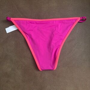 Victoria’s Secret swim bottom. Cheeky, pink color to show your tan. Bought a medium and large. Selling the medium; reviews at the time said ran small, but I didn’t believe it and the medium digs a little on me.