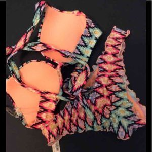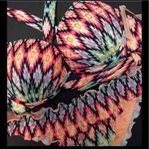 NWT Victoria's Secret bikini in ikat foil chevron geometric red teal mint orange black:34B (should also fit 32c as it ties at back) or 34D (should also fit 32dd as it ties at back) push up top+XS or S RUFFLE ITSY BOTTOM