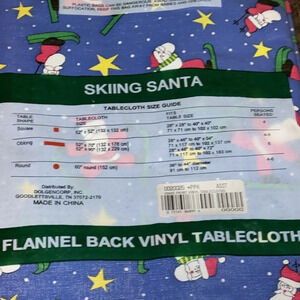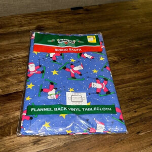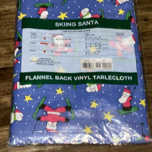 NWT VTG Holiday Style Flannel Back Vinyl Tablecloth 52x70 Rectangle Skiing Santa Claus
