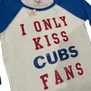 BRAND NEW NWT Vintage y2k Women's White Blue Red Bedazzled Jeweled Sparkly Victoria's Secret LOVE PINK 'I Only Kiss Cubs Fans' MLB Chicago Cubs Baseball 3/4 Sleeve Shirt Top Sz L
