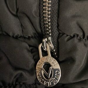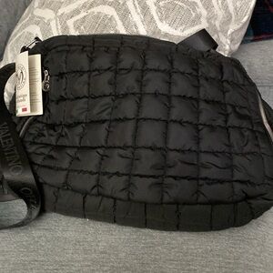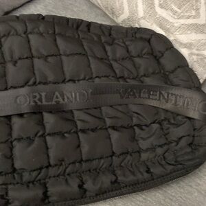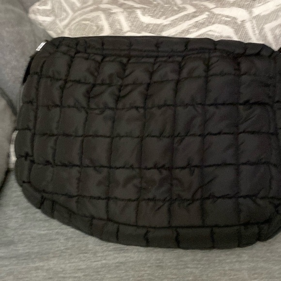 Has 2 side zippers, 2 compartment, one middle zippered pouch, one inside side zippered pocket