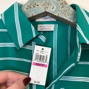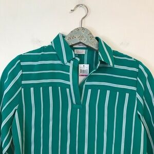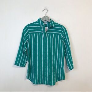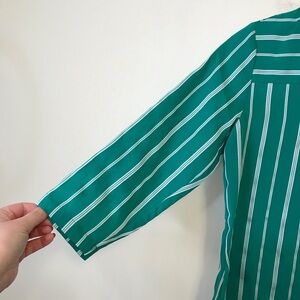 Features: Medium toned green, vertical white stripes, collared popover top, 3/4 length sleeves