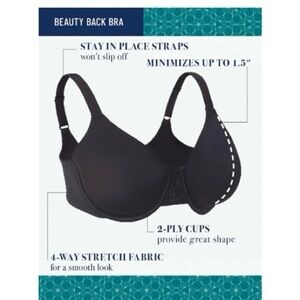 This Beauty Back Minimizer bra is made especially for fuller figures that want to reduce the bust line up to 1 ½ inches. Non-padded underwire cups provide the coverage and support that you need for all day comfort. The invisible neckline looks smooth under your favorite T-shirts and silky blouses. Wider, honeycomb cushioned straps adjust from the back, and the leotard back styling keeps the straps in place all day. The triangle center panel has an embroidered lace detail that fits flat against the breast bone.