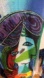 Absolutely gorgeous & a true statement piece, this kimono is stunning! Beautiful & fully saturated colors; blue w/green, golden yellow, purples & bits of red & white throughout; shown in the artwork, stripes abstract dots, etc. The artwork/face on the back is outlined in sequins & beads while the artwork/face on the front is outlined in beads as well & it’s embellished on the sleeves & hemline with tassels.