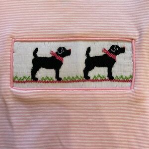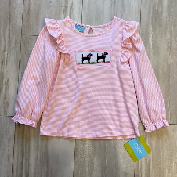 Velani Classics long sleeved top, cute black dog smocking on the front, ruffle detail on shoulders, pink and white stripes, elastic at wrists, keyhole button on back, size 6X, new condition and with tags