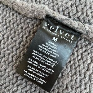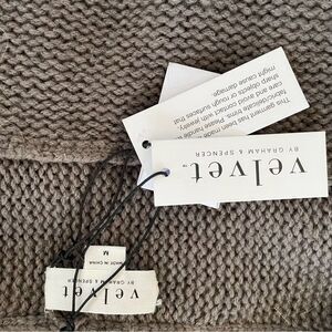 New with tags, Velvet by Graham and Spencer long open front cardigan with bucket pockets and fringe across the back. Mocha color. Knit is acrylic, wool, nylon and alpaca blend. Measurements are approximate and taken while laying flat: 38” shoulder to hem and 20” armpit to armpit with the front opening touching