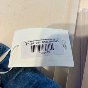 NWT Denim Blue Distressed Embellished Crinkle Joggers. They have a drop crotch design and a crinkle texture, these joggers are both stylish and comfortable. Has a happy face patch embellishment. The fabric content is 80% cotton and 20% Made in Italy, these joggers are adorable! Size XS