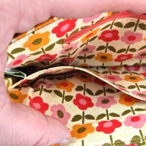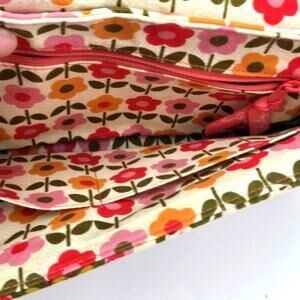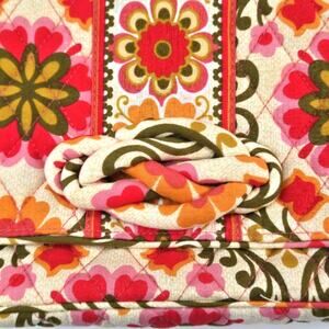 New with tags Vera Bradley flap shoulder bag in a vivid garden floral print, hot pink, coral, orange, and olive against a creamy background, fully quilted in signature Vera style. Classic baguette shape with structured sides, a chunky resin buckle, and magnetic closure. Inside is lined with bold daisy graphics, complete with card slots and zip pocket—this one’s built for color-lovers and Y2K maximalists. Never used, crisp and clean inside and out.