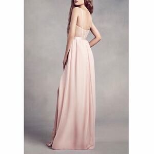 Subtly sophisticated, this White by Vera Wang bridesmaid dress features a silky charmeuse bodice, illusion back and a flowing, slit chiffon skirt.