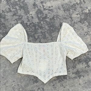white eyelet crop top with puff sleeves and a square neckline, featuring a pointed hemline.