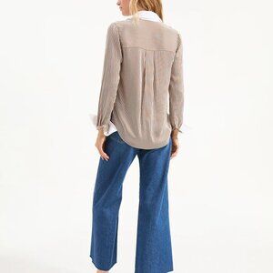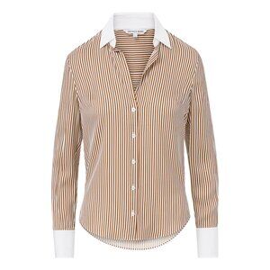 Expertly tailored from premium stretch silk, the Amelia shirt features a trim collar and wide barrel cuffs—both in contrast color—plus darting at the bustline for a feminine finish. Consider this brown striped shirt a timeless addition to your wardrobe that you can pair with anything and everything.