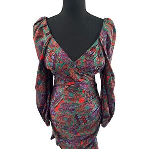 Steal the show in the paisley-printed Bellino Dress from Veronica Beard. This jewel-toned mini dress features a figure-flattering ruched and gathered front, a wide open neckline with wrap-around detailing, and balloon sleeves that are finished with elastic cuffs.