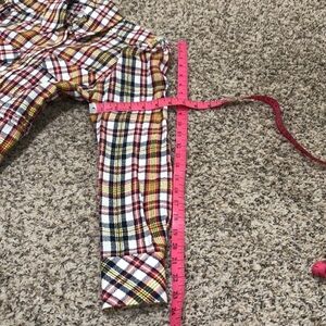 New with tag no flaws. Long sleeve, puff sleeve, collared, button down front mini shirt dress with cinch waistband and four functional patch pockets. It is a cotton, linen and polyester blend with no stretch. The color name is red multi, which is mostly white with red, yellow, and black plaid print.