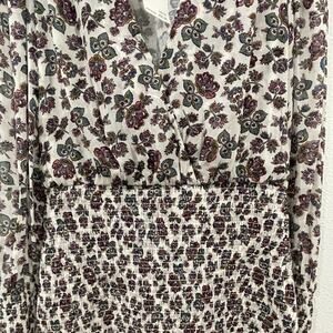 Veronica Beard's Darrah Dress is crafted of cotton and features a smocked skirt and cuffs. It is adorned with a vibrant floral motif.