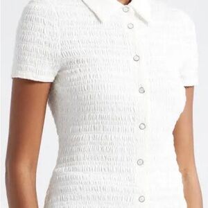 Chic white blouse with textured design. Features button-up front and short sleeves. Ideal for versatile styling.