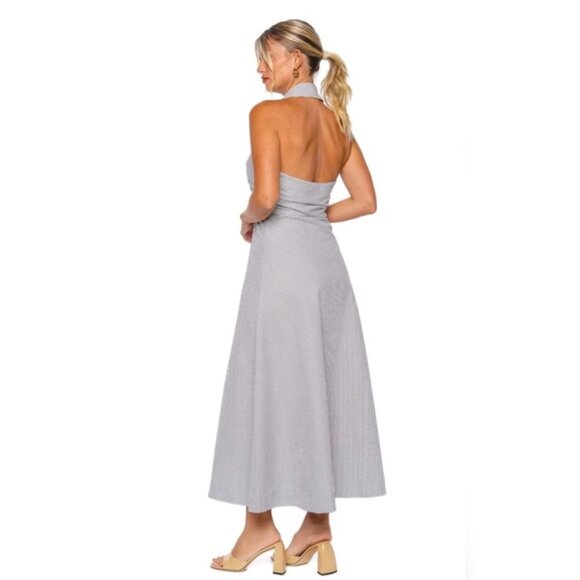 sophisticated and versatile halter-neck midi dress with a contemporary twist. It features a classic button-down design down the center front, adding structure and visual interest. The halter neckline is complemented by a pointed collar, blending feminine elegance with a touch of tailored style.The fabric is subtly textured, showcasing a fine striped pattern for a timeless yet modern look. The fitted bodice accentuates the waistline, creating a flattering silhouette, while the open-back detail adds a bold and unexpected element of allure. The skirt flares out gently into an A-line shape, offering ease of movement and a universally flattering cut.