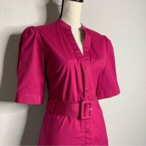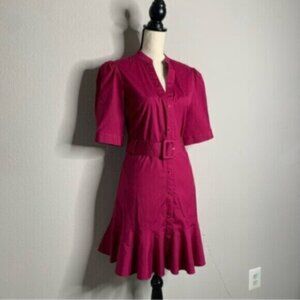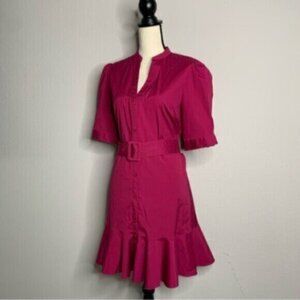 Stylish and elegant dress in a deep magenta or raspberry pink color. The dress features a V-neckline with a collarless design. It has short sleeves that end above the elbows with subtle gathers at the shoulder, adding a slight puffed effect. The dress is buttoned down the front with small buttons that match the fabric, maintaining a sleek and seamless appearance. The waist is cinched with a matching belt, which has a rectangular buckle and adds definition to the silhouette. Below the waist, the dress has a slight flare, ending in a ruffled hem that gives it a playful and feminine touch.