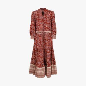 Crafted in a rust multi floral print, the dress features a V neckline, button front, and three-quarter sleeves. With a drawstring waist and fit-and-flare silhouette, it has a hem that falls below the knee, making it suitable for casual or semi-formal occasions.