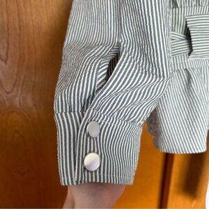 This stylish belted jacket features a blue and off-white striped seersucker fabric, perfect for layering in warm weather or smart-casual outings.