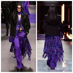 Seen on the SS23 runway, this dress embodies Versace’s signature mix of sophistication and confidence — blending structured tailoring with feminine fluidity. The vivid purple hue and sculptural draping make it a true collector’s item for any fashion connoisseur or Versace enthusiast.