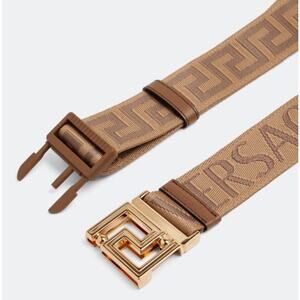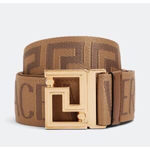 NWT Versace All-Over Logo Reversible Gold Buckle Brown Greca Ribbon Belt $425