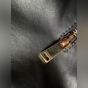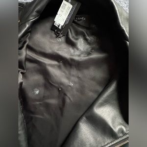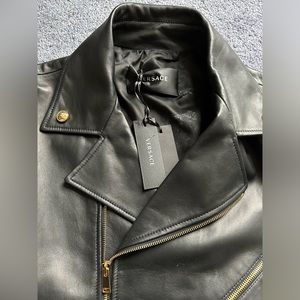 Brand new biker jacket from Versace. 100% authentic with tags still attached, never worn. Condition is perfect with the exception of some markings on the satin lining (see photo; perhaps deodorant it foundation) that can most likely be cleaned. Jacket is done in full buttery soft leather with gold hardware (Medusa buttons on collar and zippers). Sz IT 58 and fits typical for Versace ready to wear.