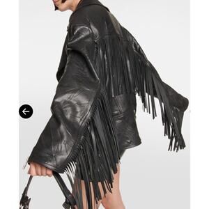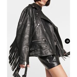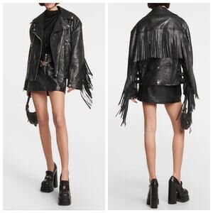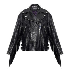 Make a bold statement with this authentic Versace Runway Oversize Leather Jacket, featured in the Spring/Summer 2023 Collection, Look #9. Crafted in luxurious black leather with dramatic fringe detailing throughout, this standout piece embodies Versace’s fearless runway vision, blending rock-chic edge with Italian craftsmanship.