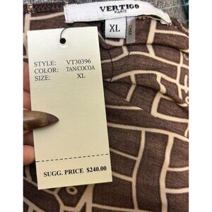 This Vertigo Paris dress features a striking brown and tan geometric print, offering a sophisticated aesthetic suitable for professional settings. Designed in an XL size, it provides a comfortable fit while maintaining elegance. The dress's unique pattern and flattering cut make it an excellent choice for enhancing your professional wardrobe.
