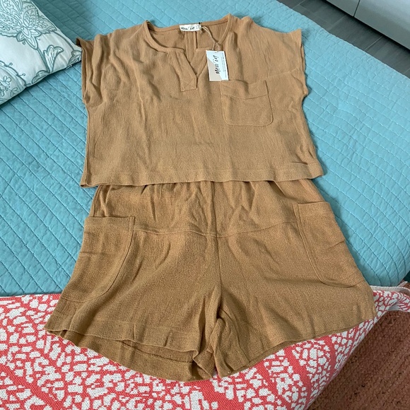 This is a very nice boutique brand short set in a toast color with a cool linen texture. Shorts are high waist with elastic back to provide stretch. Phone pockets on sides.
