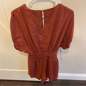 New with tags marsala romper with cinched sleeves, pockets and elastic waistband. Lined shorts. Super flattering fit. Size small.