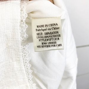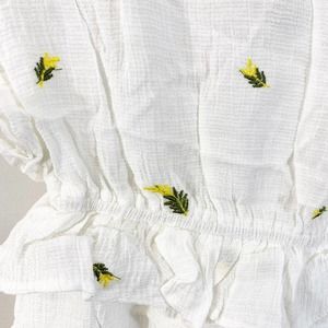 Features: white textured romper, palm embroidered detailing, V-neck, hook and eye closures at the bust, elastic waist with self-tie string, short sleeves, ruffled detailing at the sleeves and waist, lace trim detailing at the shorts hem, fully lined shorts