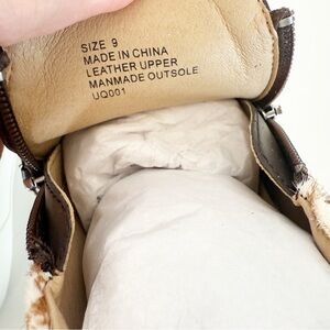 NWT Very Volatile Normande Brown Lace Slip-On Sneakers. Leather upper, lining, and insole. Upper features real horse hair, artificially dyed, from China. Brown lace like print on the upper. Easy slip-on style. Zippered closure. Round toes. Synthetic outsole. Size 9.