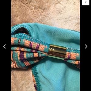 Gleaming golden ornaments slide to slightly adjust the waistband of low-rise bikini bottoms that offer full rear coverage.
