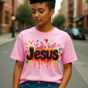 Express your faith confidently and stylishly with this vibrant "Jesus" graphic tee. Designed for comfort and durability, it's a meaningful addition to your wardrobe.