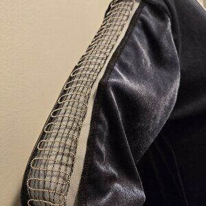 Vicky & Lucas velvet long sleeved dress. This is gray with metallic silver cutouts on the sleeves. It is brand new with tags and a size M. Armpit to armpit measures 19 inches and shoulder to hem is 34 inches.