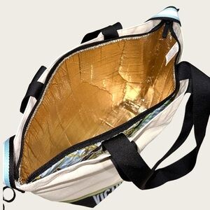 The Removable insulated liner (imported canvas and nylon) has Shoulder strap with top zip closure Outer material: Canvas approx 16" L x 12" H x 6" & Removable zip closed insulated liner (canvas and nylon) snaps in/out