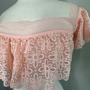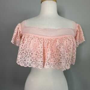 Off the Shoulder Bralette Top. Pink Floral Lace. Off the shoulder short sleeves.