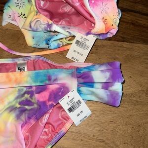NWT Victoria’s Secret PINK rainbow tie dye bikini set. Ruffled perforated floral top with a ruched side bottom. Size XS