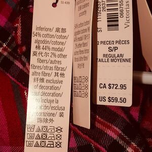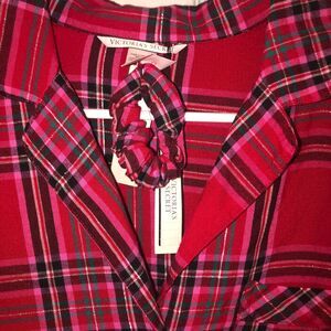 Brand New Victoria's Secret Womens PJ Top, Cherry Red Plaid, Gold shimmery thread accent throughout, Button Up with Long Sleeve Size Small Petite Includes a matching hair scrunchie! Machine wash. Measurements: Pit to pit: 20" Length: shoulder to hem - 25" Sleeve: 21.75" Smoke and pet-free home. Thanks for visiting the Odd Goblet!