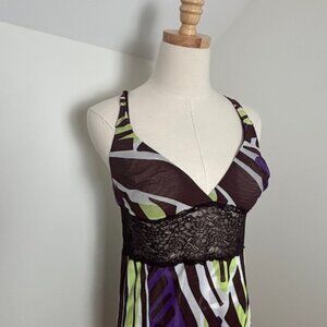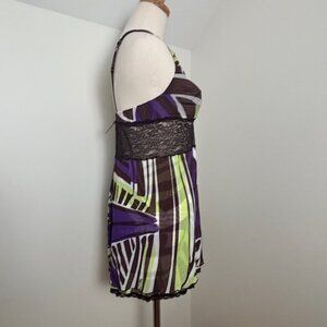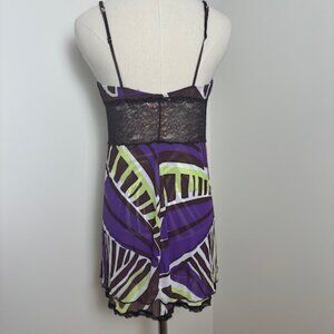 This is a NWT Victoria's Secret babydoll nightie with a lace inset at the midriff. The pattern is an abstract stripe pattern in several bright and bold colors, such as purple, chartreuse and white, plus brown. The nightie pulls over your head. It has adjustable straps and has a lining of the same material from the waist down. Material is 90% nylon, 10% spandex and the lace inset is 83% nylon, 17% spandex. Hand wash recommended.