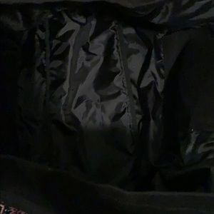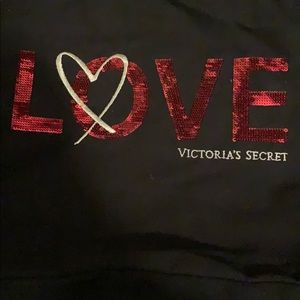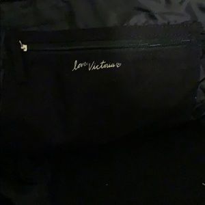 One black duffel bag by Victoria’s Secret. Condition is new with tags. It is black and says “Love” in red sequins. It measures 20 inches long, 5 inches wide, and 13.5 inches deep. It has a zipper pocket inside.