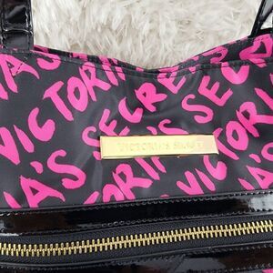 Victoria's Secret Black Fuchsia Logo All Over Satin Bag