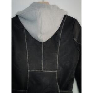 Trendsetting faux leather moto jacket finished with exposed seams. Attached hood. Notch lapels. Long sleeves. Exposed zip front. Waist mock zip pocket. Waist mock flap pocket. Waist zip pockets. Belt loops. Belted waist. Gray hoodie. Gray seams. Cotton trim Lined Polyurethane. Approximate measurements; Pit to pit 19.5"