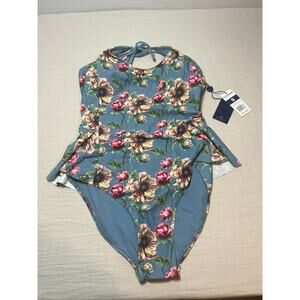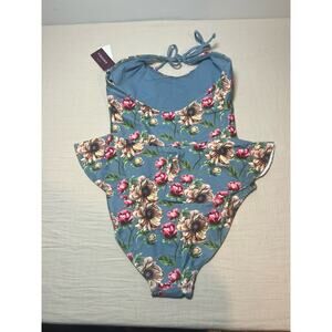 NWT Vigoss Halter One-Piece Womans Swim Suit Blue Floral Peplum