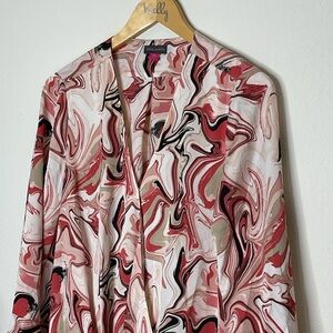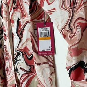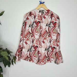 A brand new silky red sepia top. Detailed with a wrap style top (button on the bust) and bell sleeves. Anniversary style, groovy top.