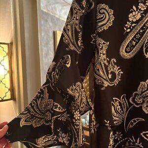 Beautiful and flattering black floral bell sleeve blouse. The front is shorter and really shows someone's figure. Looks great with jeans or black pants!