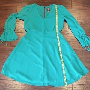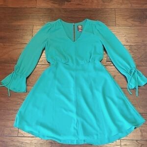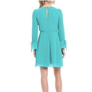 Ruffled trim and ties highlight the cuffs of this picture-perfect chiffon minidress. True to size. - 34" length - Hidden back zip; keyhole with button-and-loop closure - V-neck - Long sleeves with elastic cuffs - Lined, except sleeves