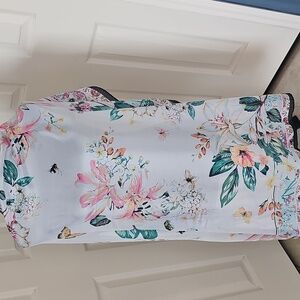 A bright floral print adds a charming finish to a satin scarf that easily elevates your look.