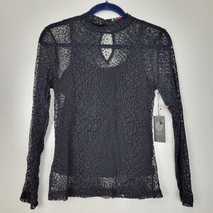 NWT Vince Camuto Mock Neck Long Sleeve Mesh Leopard Print Top in Black