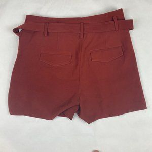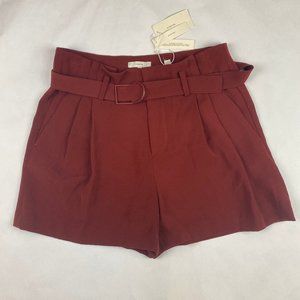 Paper Bag style, belted waist maroon shorts feature pleated front, zipper and button closure. Pockets.
